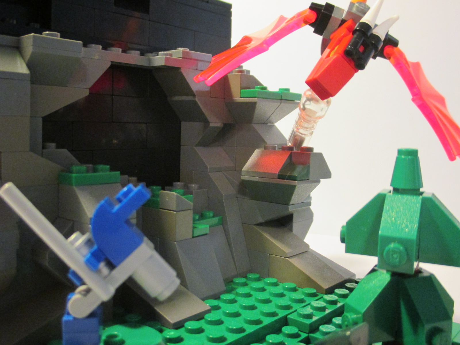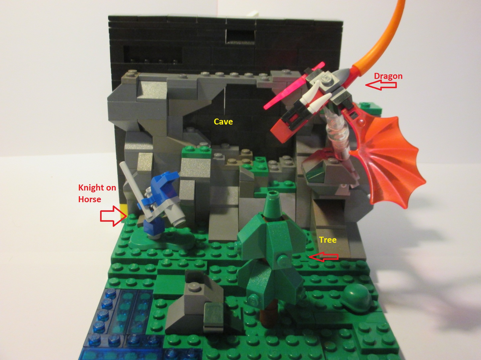 Below, you will see 3 pictures. Each is a different view of a landscape with 2 characters, a knight on a horse and a dragon. The first of the three pictures has been edited to highlight each major feature. From these pictures, your challenge is to develop a short story or a poem based on what you see and what you imagine.