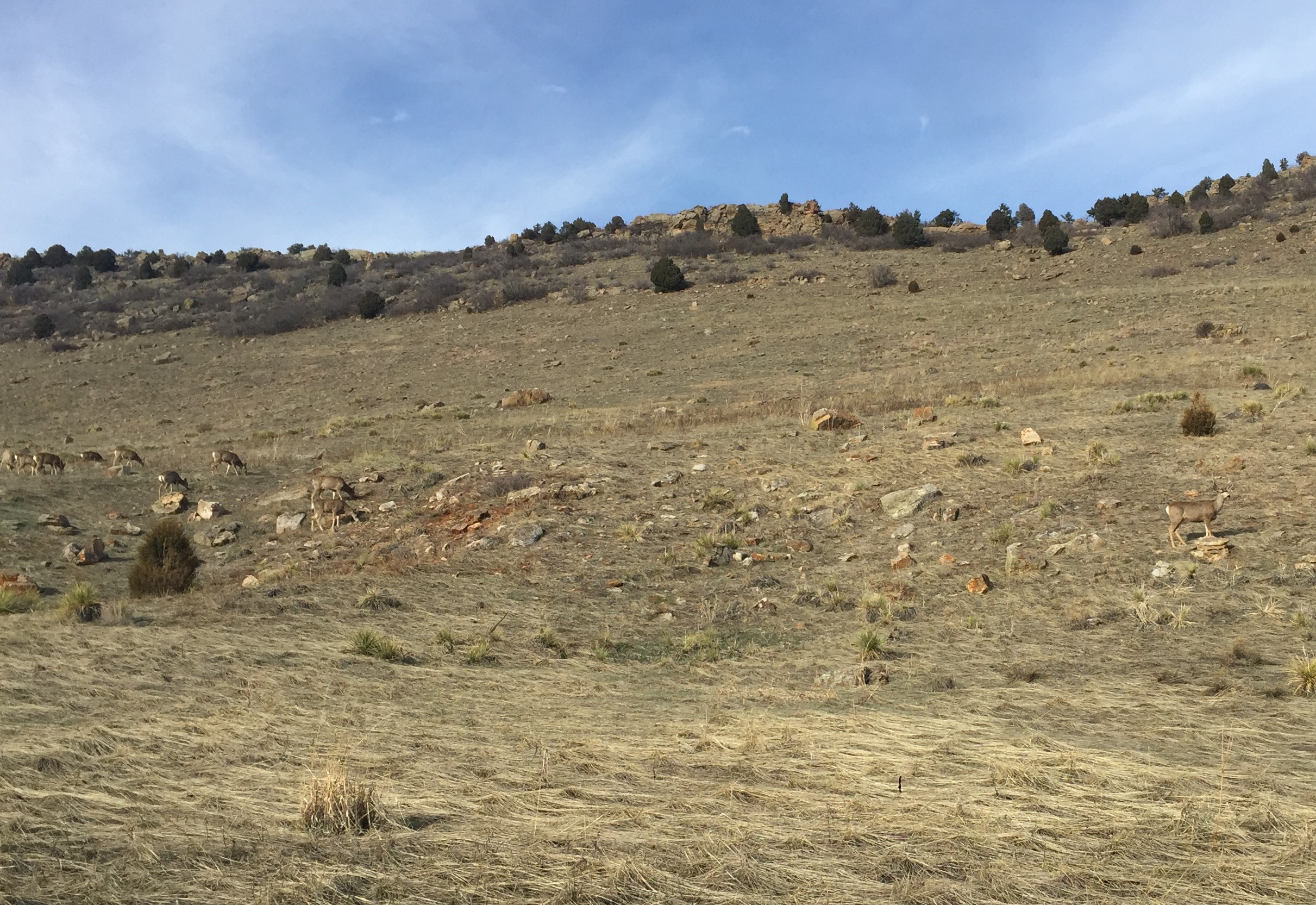 After that little encounter, I continued on my way. I passed by a few more people, before hiking up to the crest of a gentle hill, only to stumble upon a huge herd of muleys about twenty yards east of me. The wind was blowing against my face, so the deer didn’t smell me before they saw me. Not that would really matter. Those things are basically pets at this point. They live in Ken Caryl Valley. They’re pretty safe from large predators in the valley and people probably feed them. Of course, that leads to a handful of issues, including overpopulation, that I could rant about until the cows come home. But, that’s a rant for another time.
