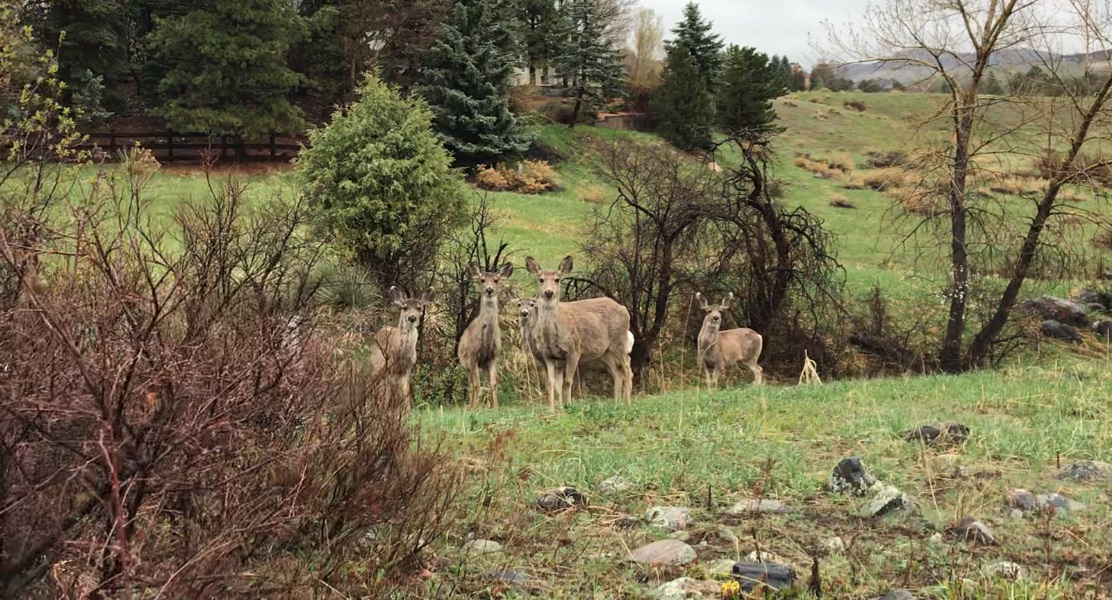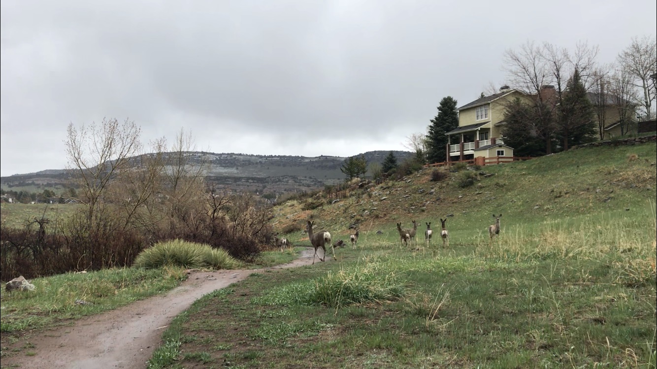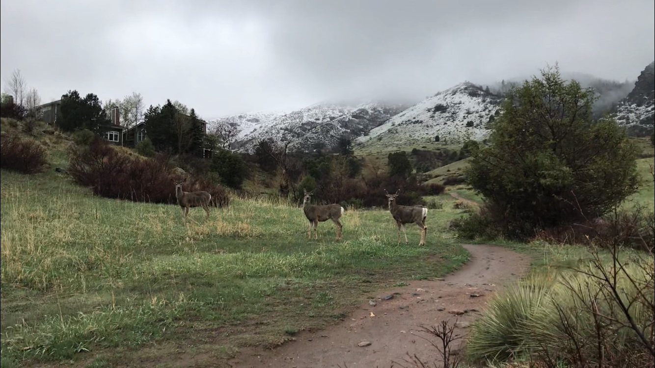 As I carefully planted my boots in the wet soil, I heard more movement in a brushy gully to my left. When I glanced that way, I met eyes with a skittish mule deer doe, who was peering from around a flame willow to watch me walk by. She was skinny after last year’s rough winter, and little tufts of winter fur were missing from her shedding hide. Beyond that, she looked young, healthy, full of energy, and desperately ready for summer (weren’t we all). When I got a little close for her comfort, she turned tail and leapt over a boulder, crossed the trial, then cleared a worn wooden fence into someone’s (presumably empty) backyard where I lost sight of her.