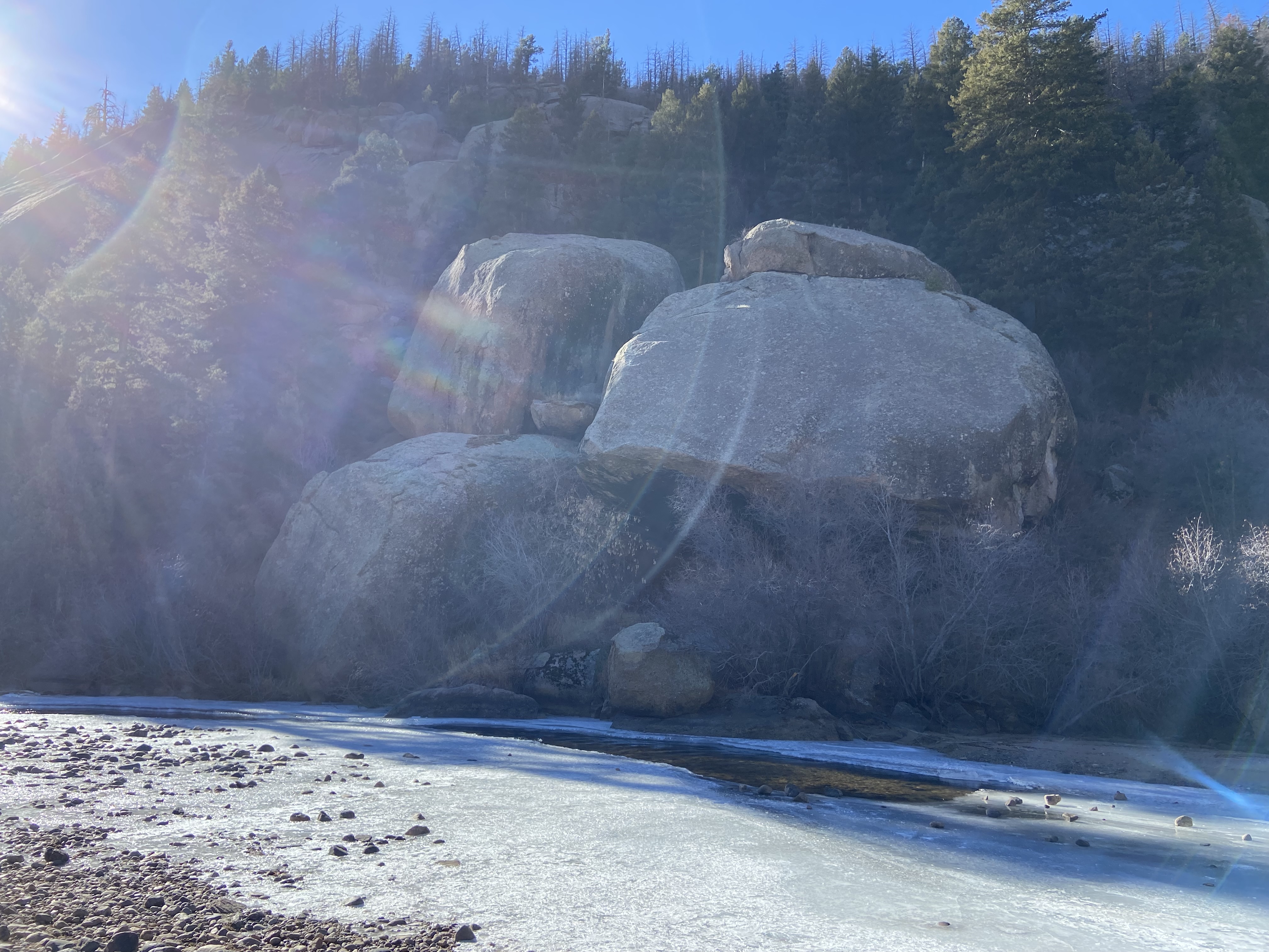 Over this same weekend, Dad and I took the jeep through some of the state land in the mountains straight west from my house. We raced over miles upon miles of washboarded dirt roads through Ponderosa wilderness, up and over mountains and foothills, past campsites and trailheads, till we reached the banks of the South Platte River, miles away from the nearest house. There, we sat along its banks, skipping rocks across the choppy river waters.
