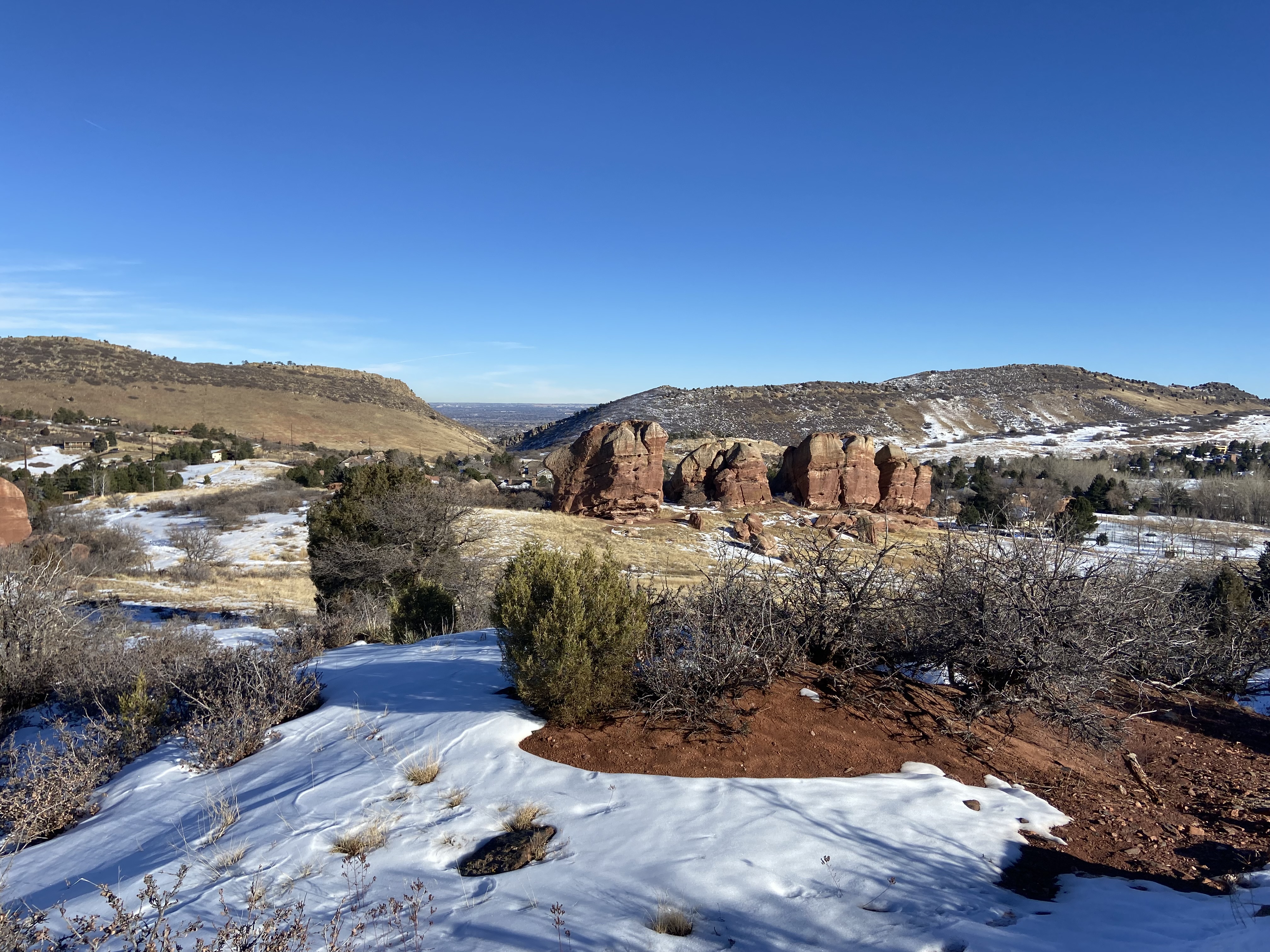 But, across the field from God’s giant red Ass, are more red rocks which I like to scale up so I can sit atop the world and enjoy some alone time in the sun and wind. Few people go up those rocks, especially in waist-deep snow. But, me? I’m undeterred.