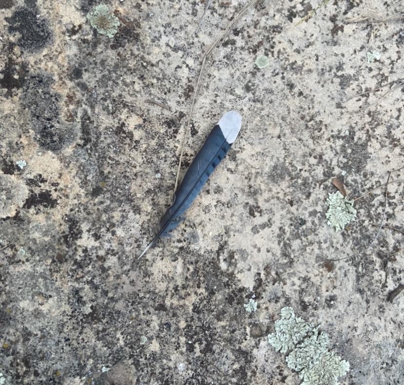 When I felt it was okay to, I silently inspected the Blue Jay feather, without touching it. It didn’t feel right to touch or to move it. I can’t even begin to explain why that was. It just… well… was. And, I obeyed that feeling. Of course, I still took plenty of pictures, both of the feather itself and the surrounding landscape. And, I couldn’t help but find a small chunk of sandstone to bring back home with me. But, I left that feather where I’d found it, wondering why it was there. Or rather, why it felt so… purposefully placed there.