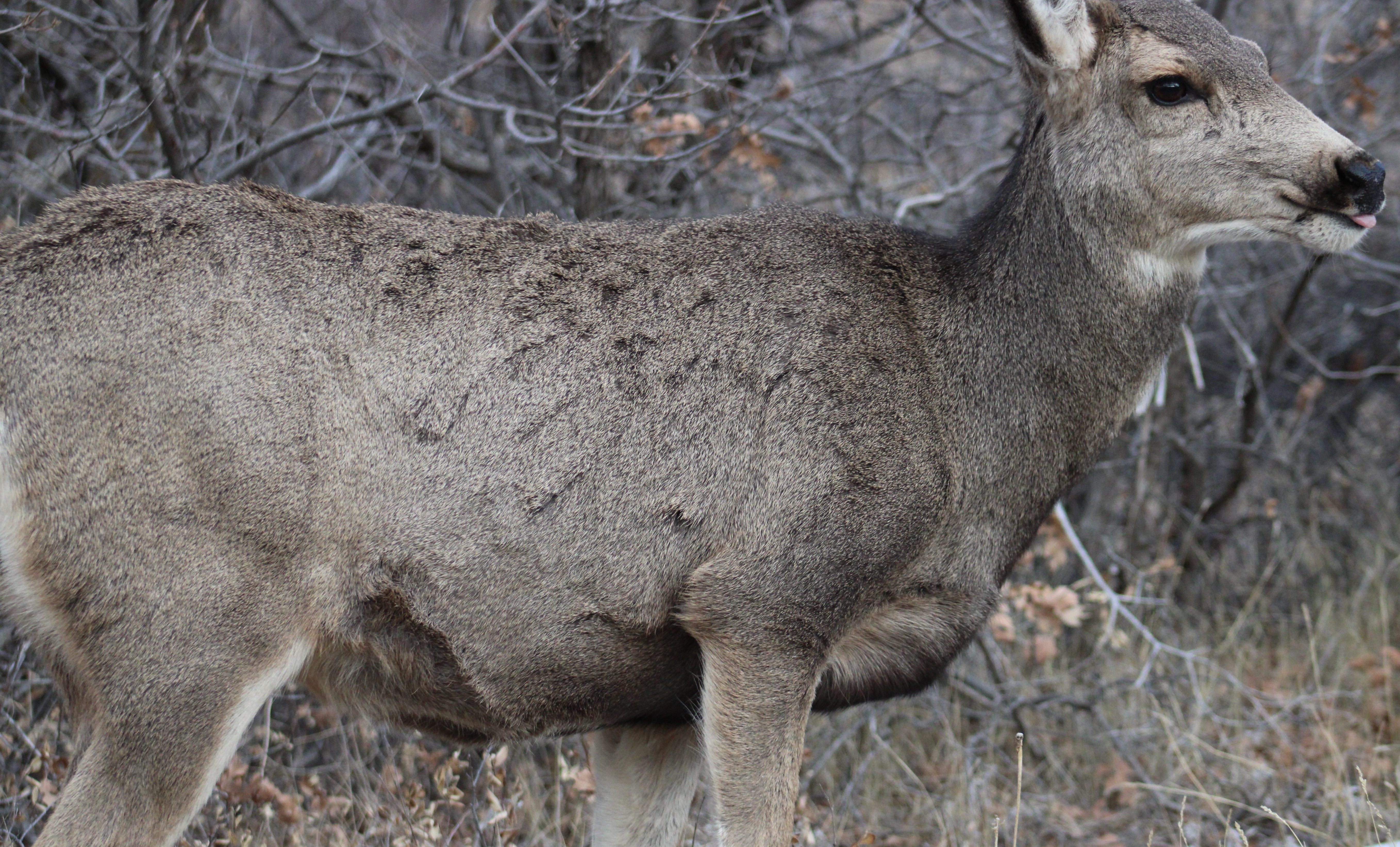 Soon, the whole deer came into view. I recognized her as one of the older muley does in the valley. I first saw her a couple springs before, when I just got back from living in Gig Harbor, Washington. This year (2022), she had two doe fawns, both of whom weren't far behind her as she came closer to me on the hogback.