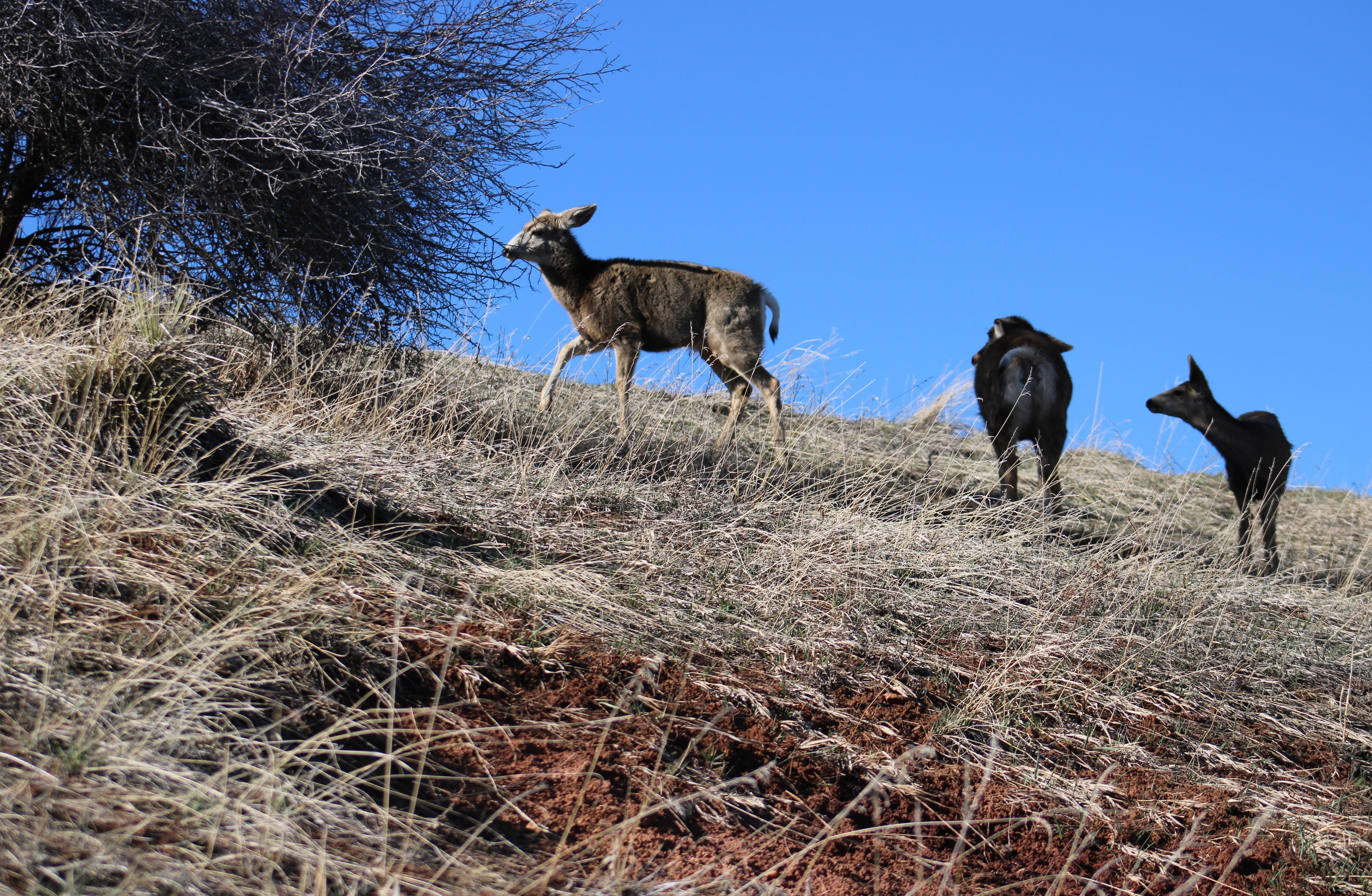 It was a perfectly sunny day. Calm and quiet. Not a cloud in the sky. Not too warm and not too cold. Many birds were returning to Colorado from their winter ranges, including dozens of robins and red-headed finches, who were busy picking some remaining acorns off the mostly bare branches of Gambel oaks, or digging around for worms in the soft red soil along the trail. I even spotted a magpie carefully sneaking up to a buck who was resting in the shade of a Ponderosa, in an attempt to steal some of his shed fur to insulate a nearby nest.