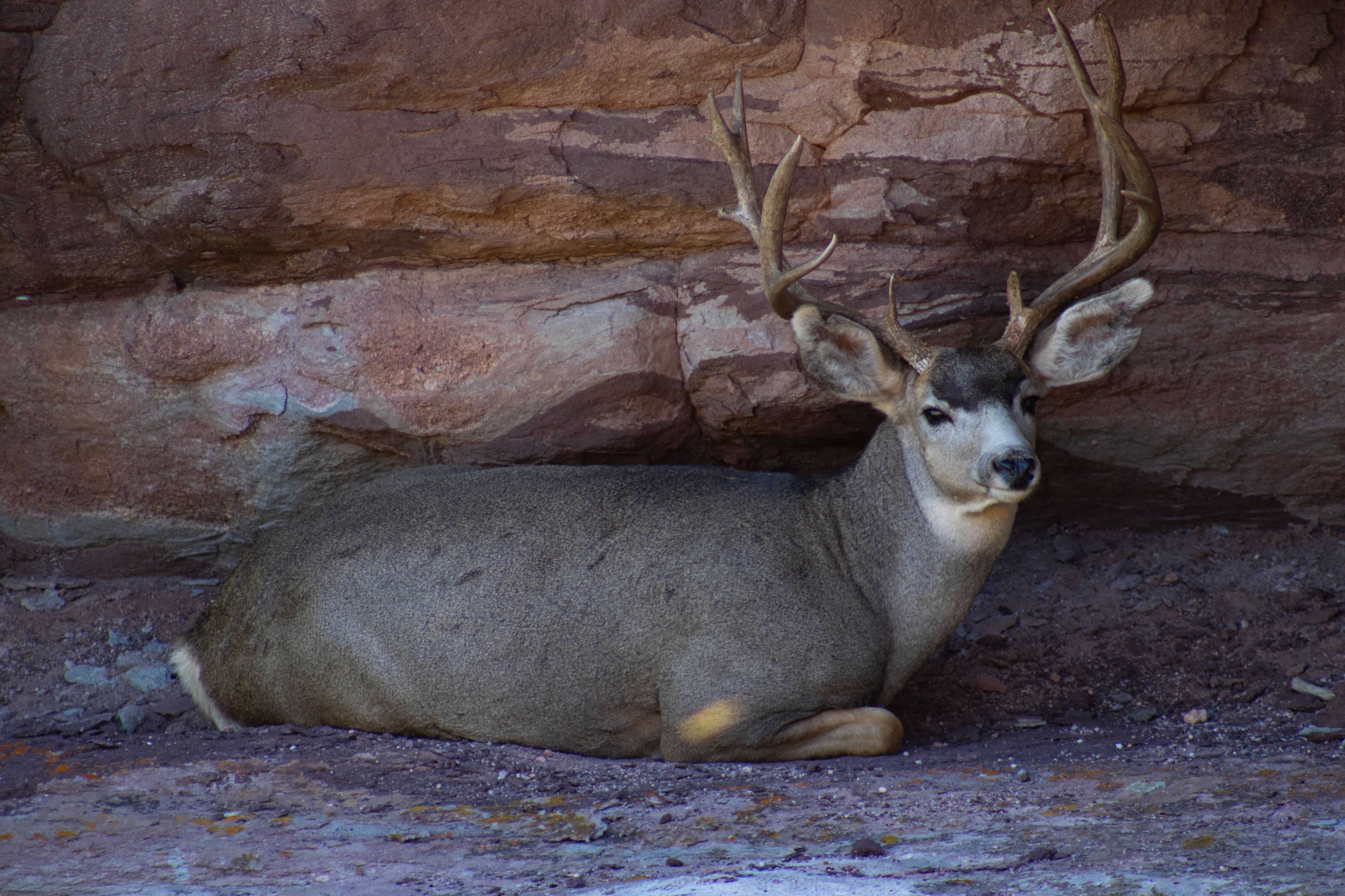Like most of the valley deer, El Jefe didn’t seem alarmed that I was there. He was simply laying in the shade of the red rock wall alcove, looking at me with a tired look in his eyes. Luckily for me, I already had my camera set up on its tripod with a 300mm lens attached to it (this semester taught me how to be “camera ready” for moments just like this one). All I had to do to get El Jefe’s picture was move the camera around on its tripod and zoom in the lens until the buck filled up the viewfinder. Then, a few seconds later, the camera clicked, just before El Jefe turned his head around to face the wall of his alcove.