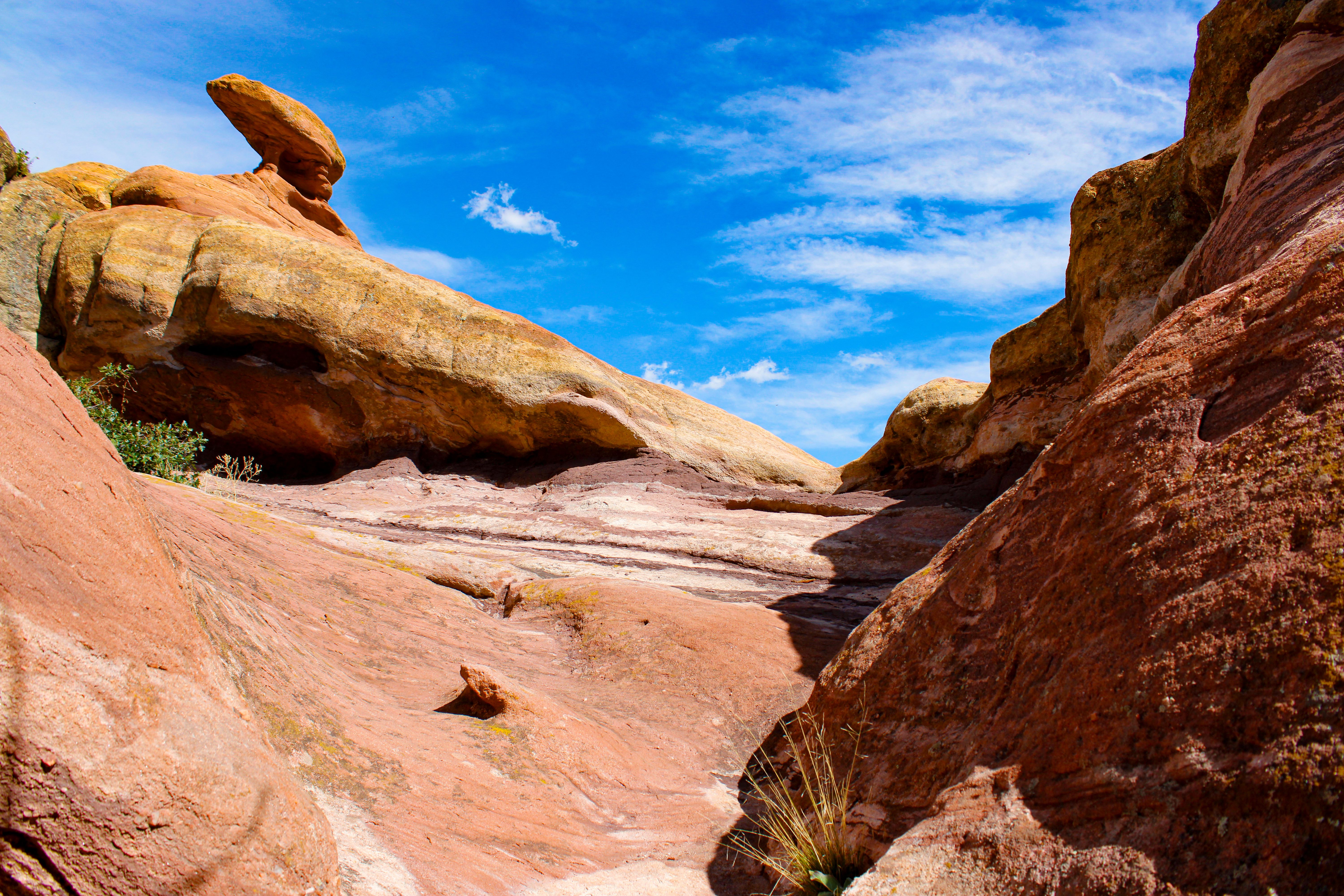 To the north and west of the Bradford house are more red rocks, though they’re not nearly as tall or organized as God’s Ass. Still, the north and west red rocks are very picturesque and full of places and things to see. If I hike around to the western edge of the red rocks, there’s a small trail that leads through the Gambel oaks, and to an opening shaped by thousands of years of rainwater that I can take to get on top of the red rocks. Above this opening, there’s a rock formation shaped by the wind that I haven’t come up with a name for yet, but is still a very cool formation that I’ve taken numerous pictures of.