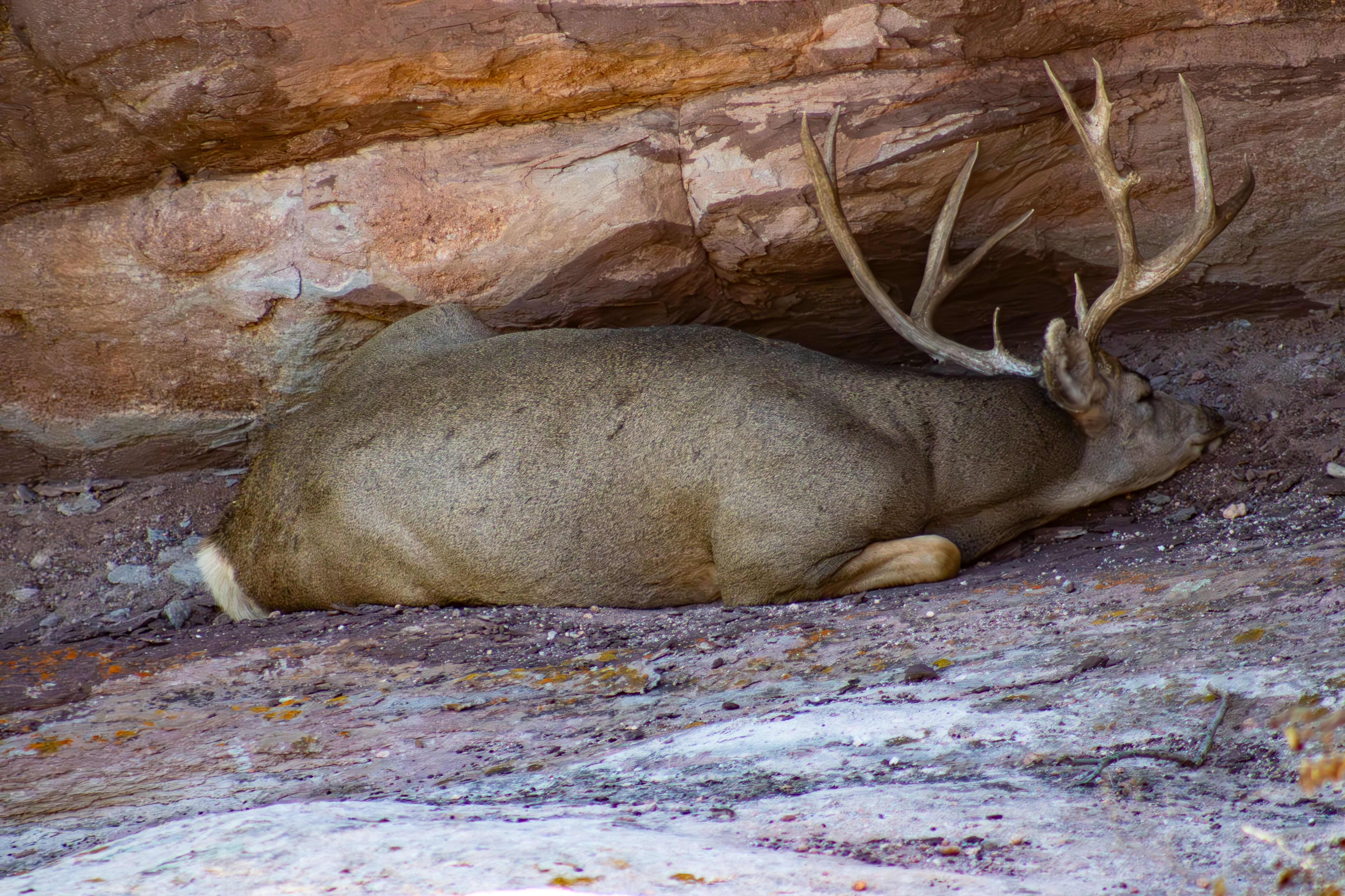 But I wasn’t done taking pictures of El Jefe. So long as El Jefe stayed bedded down in the alcove, I planned on staying right where I was to get as many pictures as I could. After all, I was witnessing something truly unique: a huge mule deer buck laying down comfortably in a red rock alcove, while I sat up on the slope just watching with my camera.