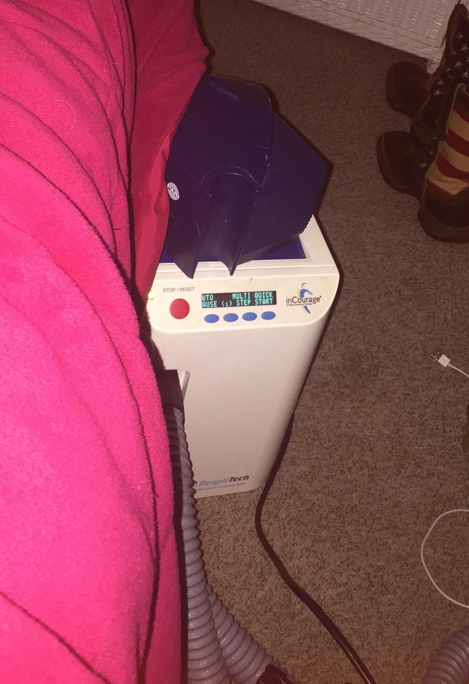 For about 13 years, from the time I was 4 years old until I was 17, I couldn't be less than 6 feet away from the wall for an hour each day. For a half hour in the morning and a half hour in the evening, I was connected to a large, 40 pound box while it shook up the mucus in my lungs so I could cough it up. I wore a vest, that was once black but then came in camo, which connected to the large white box with two large grey tubes. When I pressed a blue button on the white box, the vest I was wearing would inflate and then shake, which would then shake up the mucus in my lungs so I could cough it out.