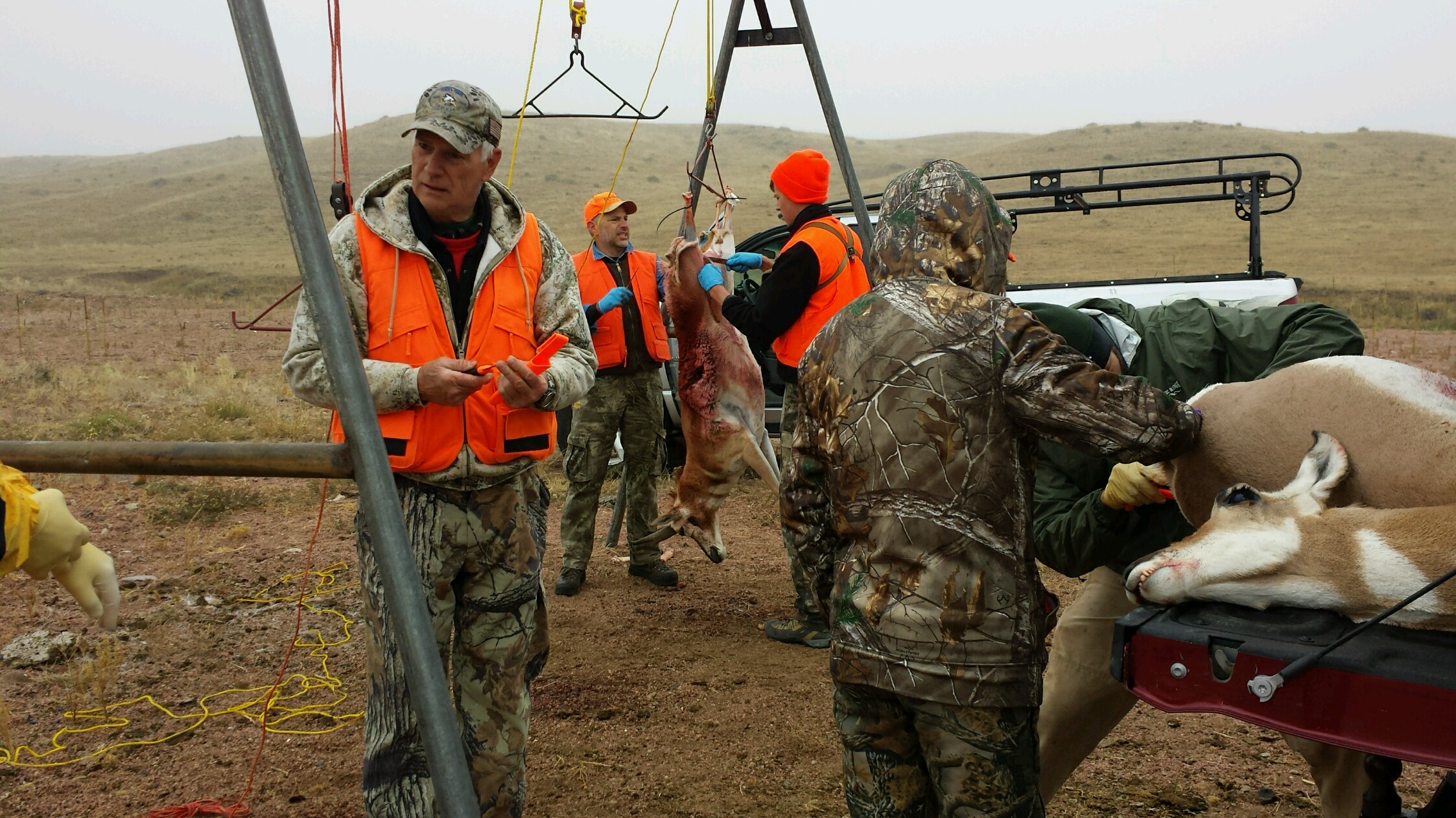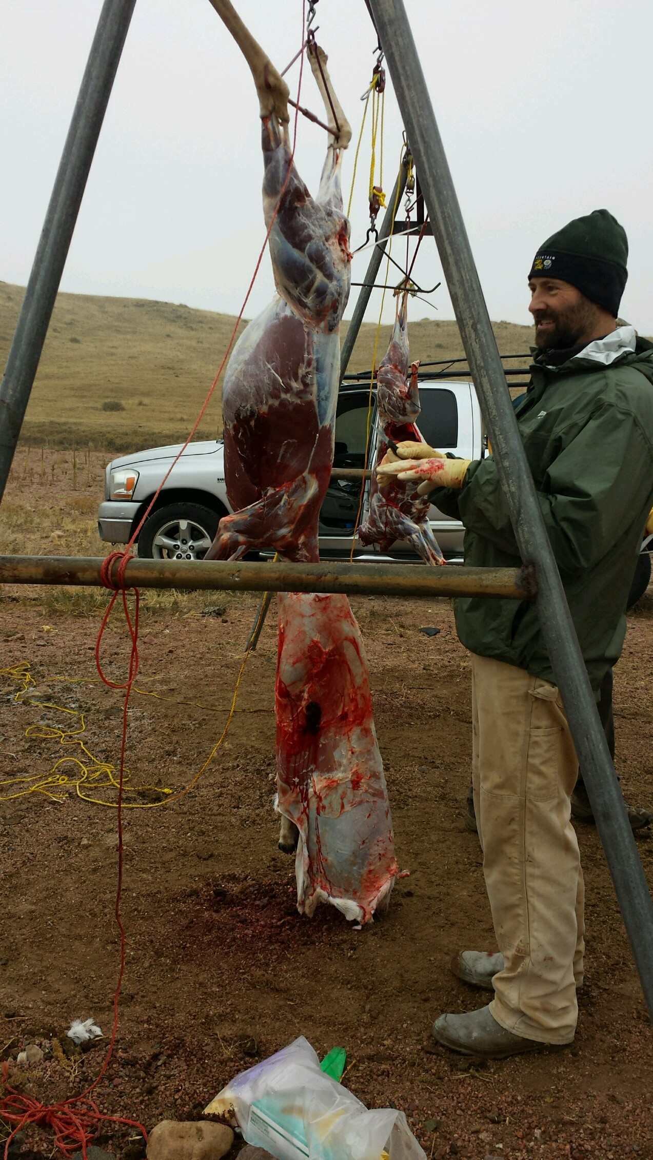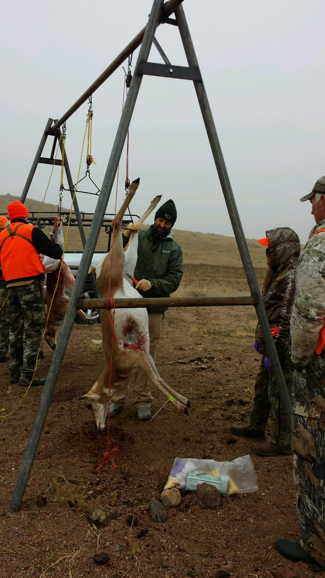 As soon as I was warm again, I walked in the cold to the skinning rack, which was about fifty yards away from camp, just as Tom backed his truck towards the rack with my pronghorn in the trunk. Mike opened the tailgate and pulled the pronghorn onto it. Mike instructed me to hold up her tail while he went to work at her rear. Before we could get to the meat, we had to remove the waste and close off the pronghorn's rectum so no meat would be spoiled. If any waste touched the meat, that meat would be immediately contaminated and unsafe to eat, even if the waste was rinsed off. There are a lot of diseases found in the waste of animals that are highly contagious and immediately spread to everything it touches. The five-second-rule is a myth!