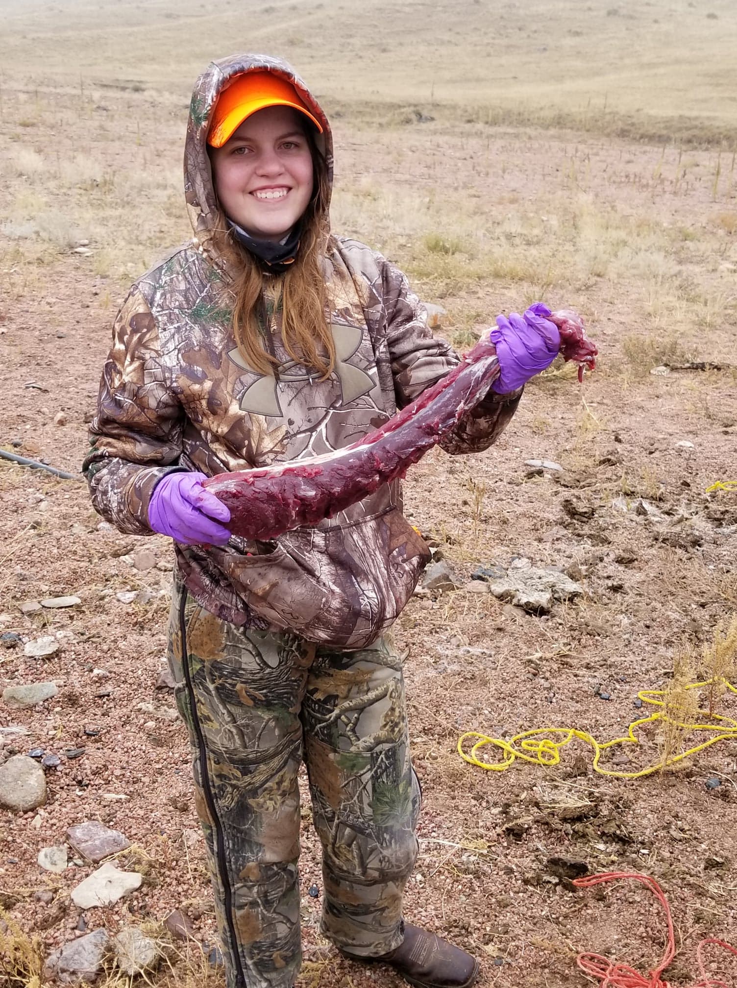 Back at the dressing rack, Mike and a few other volunteers first cut off the backstraps, which are arguably the best part of the pronghorn, or any game animal for that matter. The backstraps are the muscles running from the base of the neck to the base of the tail on the pronghorn, and they're usually cut up into steaks. Because of how valuable the backstraps were, Tom had me pose for a picture while holding one of the backstraps, before I shoved it into ice.