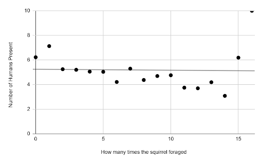 To represent Table 1’s data in a more visual form, we created a scatter-plot (Figure 1), to make it easier for us to discuss the results of our study. As we can see, there are points all over Figure 1, ranging from 3 instances of squirrel Foraging behaviors observed during a five-minute observation period, to 10 instance of squirrel Foraging behaviors observed during a five-minute observation period. Neither of those numbers seem to be impacted by the average number of humans present during those times Fox Squirrels were observed Foraging for food. In fact, the trend line is nearly flat, indicating little to no correlation between the number of times Fox Squirrels Foraged for food in five-minute period, and the average number of humans present while Fox Squirrels were Foraging for food (Figure 1).